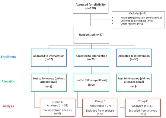 The sample size was calculated to compare the means of two or more groups via single-factor analysis of variance (ANOVA). We assumed that there were three groups to evaluate, an alpha value of 0.05, a confidence value of 1.96, a power of 1.28, an intergroup variance of 74 μV, and an error of 5.56 μV (Cohen difference) in the RMS evaluation. With this, the minimum sample size per group was 25 patients. The sample size estimated for our study included an assumption of 10% attrition each week, yielding a total sample size of 84 patients (28 patients in each group).