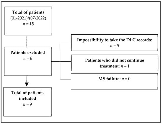 Patients and their records were collected over a period of 18 months from January 2021 to July 2022 and were pre-selected according to the following inclusion criteria: (1) patients of both sexes who lived in Colombia; (2) initial DLC records available; (3) use of MS as a biomechanical anchorage method for distalization of the dentition in the maxillary or mandibular arch; (4) vertebral maturation stage greater than 6 in the DLC according to Baccetti’s analysis at the moment of MS installation []; (5) no supernumerary teeth or maxillary lesions observed in the panoramic radiograph; and (6) patients who did not report systemic diseases or syndromes. Patients with the following findings were excluded: (1) impossibility of taking the DLC records after the MS procedure; (2) patients who refused to continue the treatment with MS; and (3) MS failure that cannot be relocated in a short period of time (no more than 2 weeks). Records of 15 patients were collected, but only 9 patients were included (Figure 1).