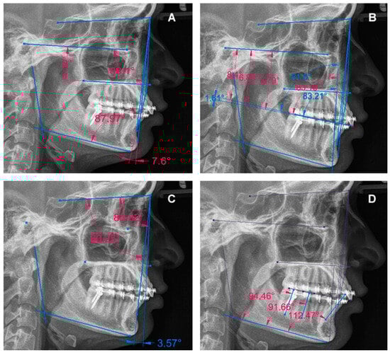 Digital lateral cephalogram analysis example. (A) Skeletal diagnosis by Kim. (B) Occlusal plane by Tanaka and Sato. (C) Position of maxilla and mandible by Riedel. (D) Dentoalveolar changes analysis by the authors.