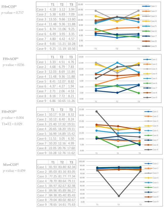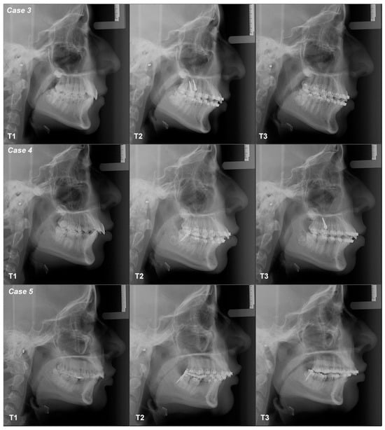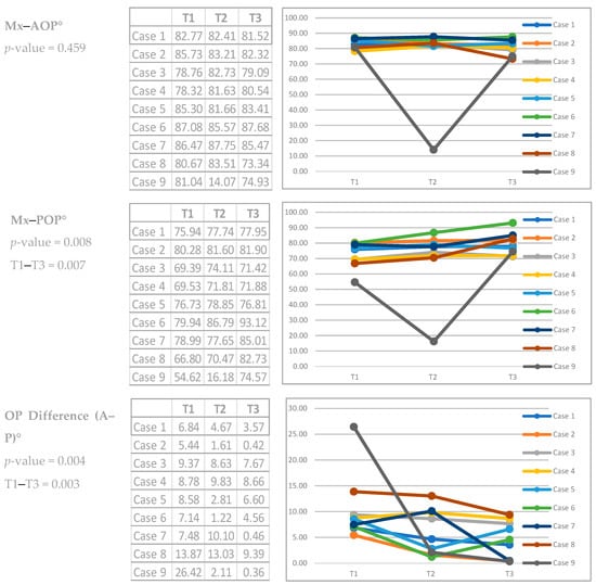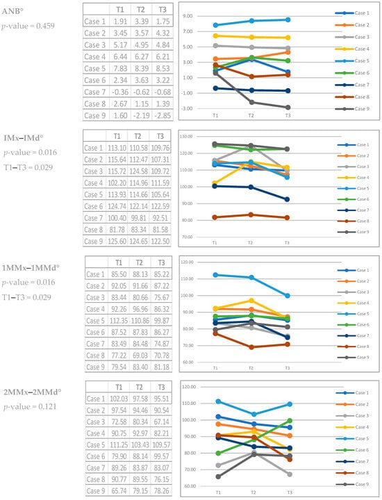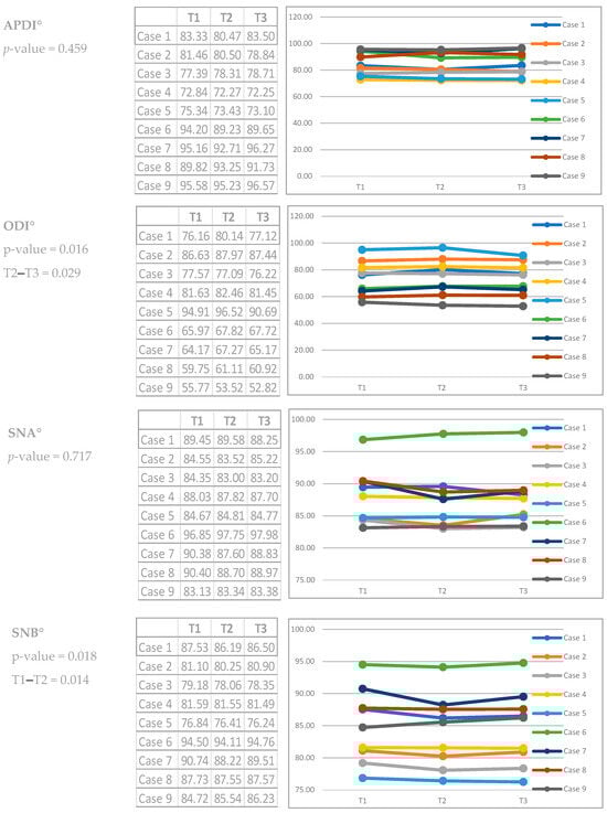 The conventional occlusal plane (COP), the anterior occlusal plane (AOP) and the posterior occlusal plane (POP) varied from T1–T2–T3 in all cases; the values increased or decreased, indicating stepping or flattening of the OP (Supplementary Table S2 and Figure 3 and Figure 4). Dentoalveolar measurements (DMs) also show differences between T1–T2–T3. ODI, APDI, SNA, SNB and ANB measurements change minimally three times in all cases, without variations in the mandibular position or in the skeletal diagnosis, except in case 3 (Supplementary Table S2).