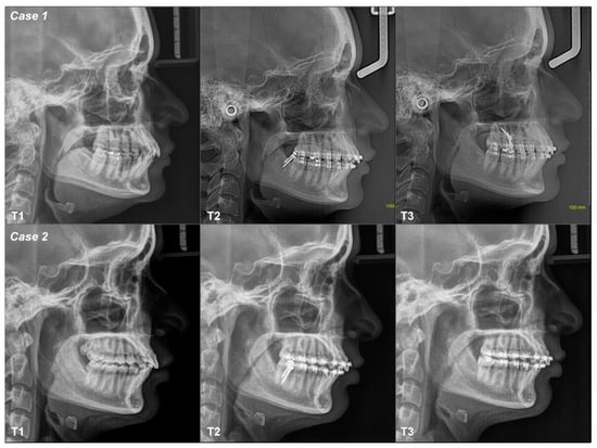 A 13-year-old female patient with a Class II canine relationship and skeletal Class II low angle. Her objective was to verticalize the incisors with two MS at the BS, achieved after three months. The biomechanics included Roth 0.022″ × 0.028″ appliances with a 0.016″ × 0.016″ SS continuous archwire with a force of 200–300 g applied through a chain mesial to 34 and 44 above the center of resistance. The COP, AOP and POP flattened between T1–T2 but tipped between T2–T3. All DMs increased between T1–T2 but decreased between T2–T3. Third molars were present during all treatment observation periods (Figure 3, Figure 4 and Figure 6; Table 1).
