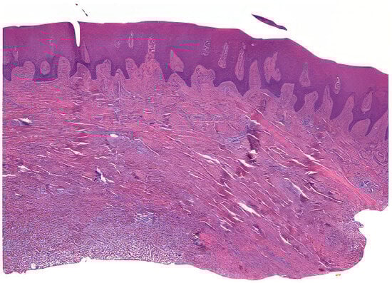 Tissue samples were collected from excess epithelial–connective graft material, which underwent shaping and finishing procedures during surgery. A total of 50 samples from 25 patients were fixed in Karnovsky’s solution (2% paraformaldehyde, 2.5% glutaraldehyde in 0.1 M sodium cacodylate buffer) for 6 h at 4 °C, followed by washing in 0.1 M cacodylate buffer with added sucrose. After fixation in Karnovsky’s solution, the tissue samples were washed in 0.1 M cacodylate buffer with added sucrose to remove excess fixative. The dehydration process involved immersing the samples in increasing concentrations of ethanol (70%, 80%, 90%, 95%, and 100%), followed by clearing in xylene. The cleared samples were then infiltrated with paraffin at 60 °C under vacuum conditions to ensure thorough embedding. Serial sections of the embedded tissue blocks were cut at 4–5 μm thickness using a rotary microtome Leica SM 2400 microtome (Leica Biosystems, Nußloch, Germany). The sections were mounted on glass slides and dried at 37 °C overnight. Hematoxylin and eosin staining was performed (