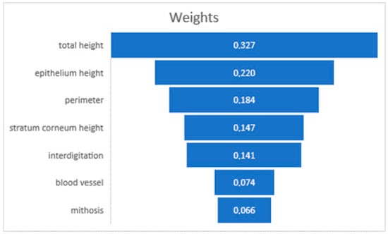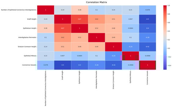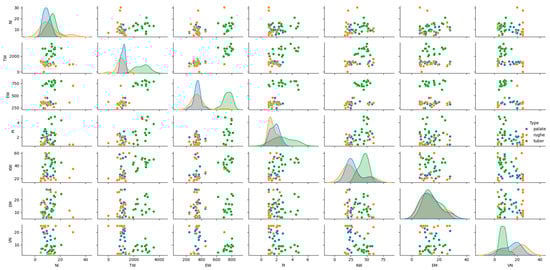 Figure 6). The histological patterns of the different types (palate, palatal rugae, tuber) were analyzed using pair plots to visualize the distribution and relationships between variables. The pair plots revealed distinct clustering of the three types based on their histological features. For instance, palate samples exhibited higher epithelial–connective interdigitations and graft height values than palatal rugae and tuber. Similarly, the interdigitation perimeter and stratum corneum height significantly differed across the types.
