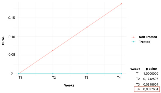 Average BEWE score over time, G3 (remineralization product-treated group): comparison of treated and non-treated teeth.
