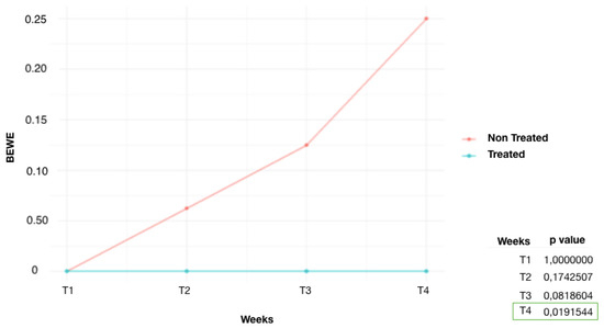 Average BEWE score over time, G2 (fluoride-treated group): comparison of treated and non-treated teeth.