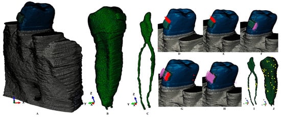 Example of 3D mesh model: (A)—2nd lower right premolar model with intact periodontium, (B)—second lower premolar with base of the bracket and NVB, (C)—dental pulp and NVB, applied vectors: (D)—extrusion, (E)—intrusion, (F)—translation, (G)—rotation, (H)—tipping, (I)—dental pulp and NVB mesh with elements warnings, (J)—second lower premolar with mesh elements warnings.