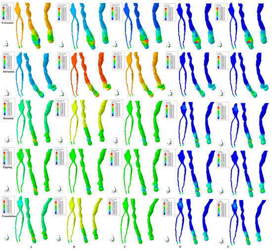 Comparative stress distribution for 3 N in intact periodontium and for the five movements: (A)—Hydrostatic Pressure, (B)—Minimum Principal, (C)—Maximum Principal, (D)—Tresca, (E)—Von Mises.