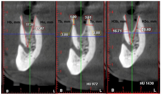 Cone-beam computed tomography (CBCT) is an essential tool for three-dimensional diagnostics of the alveolar ridge [16,17]. CBCT images were used for the postoperative measurements. They were performed immediately after the extraction and 3 months later. The measurements were taken on a paraxial section in the middle of the socket immediately after the extraction (Hb—buccal plate height; Ho—oral plate height; Tb—buccal plate thickness; To—oral plate thickness) and after 3 months (H3b—buccal plate height after 3 months; H3o—oral plate height after 3 months). The plate heights were measured from the uppermost point of the wall to the uppermost point of the maxillary sinus/mandibular canal. Plate thickness was measured 3 mm below the highest point of the wall. When the inter-radicular septa at the molar post-extraction sockets were preserved, measurements were taken in the middle of the mesial and distal parts of the socket. Therefore, the number of measurements was bigger than the number of participants (Figure 2).