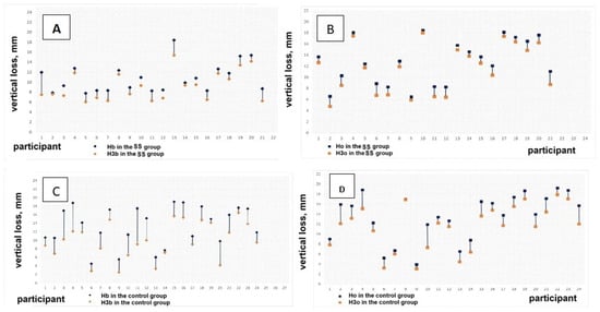 Vertical resorption of the plates in millimeters: (A,B)—in the SS group; (C,D)—in the control group.