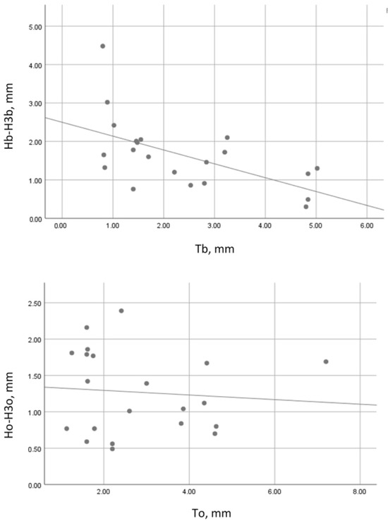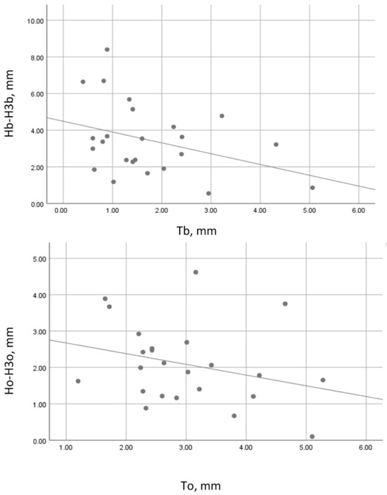 Correlation between wall thickness and vertical resorption in the control group. Tb—buccal plate thickness on day 1; Hb-H3b—vertical resorption of the buccal socket wall; To—oral plate thickness on day 1; Ho-H3o—vertical resorption of the oral socket wall.