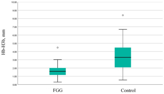 Comparison of the vertical resorption of the buccal socket wall between the groups. FGG—free gingival graft; Hb-H3b—vertical resorption of the buccal socket wall.
