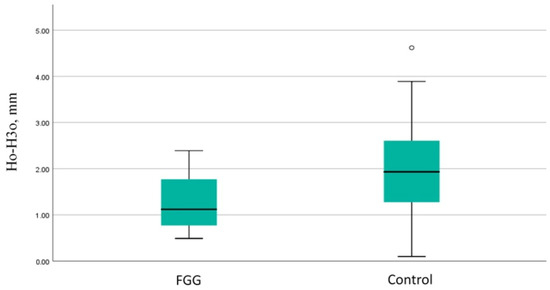 Comparison of the vertical resorption of the oral socket wall between the groups. FGG—free gingival graft; Ho-H3o—vertical resorption of the oral socket wall.