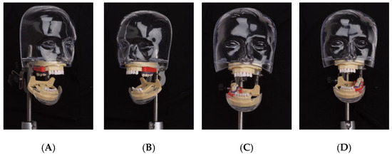 Holders with embedded teeth were placed in the posterior area of the four quadrants of the phantom head: (A) upper right; (B) upper left; (C) lower right; (D) lower left. The phantom head was placed in a position simulating the patient’s position relative to the dentist. Then, each proximal side of the teeth was restored using either technique, except for the extremities; that is, there were eight restorations in each holder.