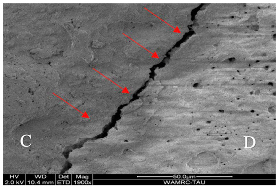 Gap between composite (C) and dentine (D) under a scanning electron microscope (SEM).