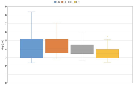 A box diagram representing the gaps, measured in microns, for the four quadrants is presented in Figure 5. The mean gaps for the upper right, upper left, lower left, and lower right were 4.232 + 1.717 µm, 4.696 + 2.311 µm, 4 µm + 1.158, and 3.591 + 1.197 µm, respectively, with no statistically significant differences between the quadrants (p > 0.136). Interestingly, both the mean gaps at the maxilla and the standard deviation for that jaw were higher than in the mandible.
