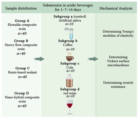 A total number of 160 samples (including 32 samples in control group) were prepared in a rectangular shape (25.0 ± 0.1 mm long, 10.0 ± 0.1 mm wide and 3.0 ± 0.1 mm thick) using a customized acrylic mold. The distribution of the samples into groups and the study design are presented in Figure 1.