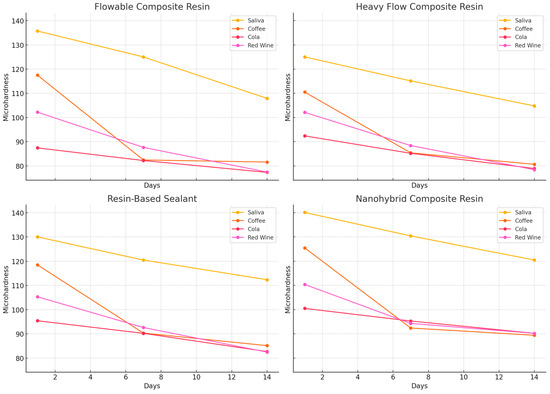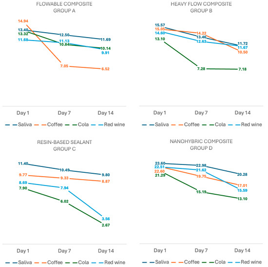 The resin-based sealants showed a downward trend in Young’s modulus of elasticity values after submersion in each of the four beverages. However, the samples soaked in cola solution stood out due to the values varying from 7.90 ± 0.17 on test day 1 to 2.67 ± 0.27 on day 14. For the same pattern with the previous materials, the nanohybrid composite resin values showed a downward direction from testing day 1 to day 14. The most significant variation in values was shown by the samples submersed in cola, decreasing by 8.19 units from 21.29 ± 1.15 on day 1 to 13.10 ± 0.64 on day 14.