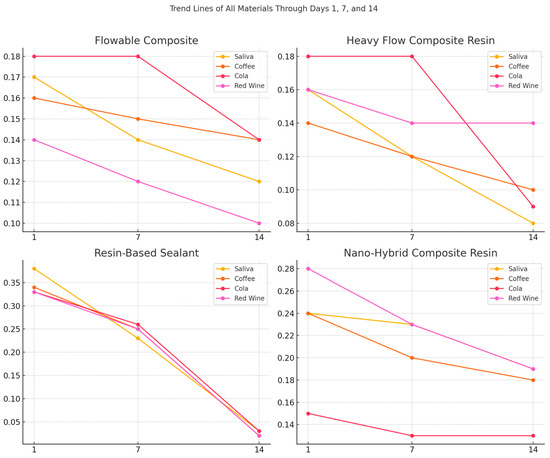 The resin-based sealants showed a large decrease after submersion in the coffee solution from 0.34 ± 0.15 on day 1 to 0.02 ± 0.01 on day 14, indicating a difference of 0.32 units. Regarding nanohybrid composite resins, it can be stated that submersion in red wine solution produced the most considerable decrease in mean values from 0.28 ± 0.11 on day 1 to 0.19 ± 0.18 on day 14.