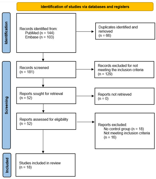 A total of 247 studies were identified following the initial search in the PubMed and Embase databases. Title and abstract screening resulted in 52 studies included for full-text reading. Of the 52 studies, 18 studies were excluded due to a lack of control group and 16 studies were excluded for not meeting the other inclusion criteria. Eighteen original studies met all the inclusion criteria and were included for analysis. See Figure 1 for a flow diagram of the included studies.