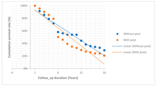 The findings indicated 10-year cumulative survival rates of around 44% for ETT with posts and 30% for ETT without posts. A comparison of studies may be difficult given the variances in methodologies, populations, materials, and follow-up periods. According to the literature, different factors affect the prognosis of ETT restored with posts. These factors include the material, length, and diameter of a post as well as the core material used [26,27]. In addition, Wegner et al. reported in their clinical study that remaining coronal walls can play a crucial role in the performance of posts and fracture resistance [28]. A long-term clinical evaluation by Raedel et al. showed a 10-year survival rate of 75.7% for teeth treated with cast posts and cores [29]. Many researchers have recommended that post placement be considered mainly for ETT with limited remaining coronal walls [30,31,32].