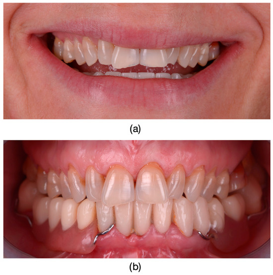 Final fixed restorations: Frontal photograph of the patient after the completion of restorative treatment with full arch-layered zirconia restorations. Final restorations are fixed with a dual cure Self-Adhesive Resin Cement (RelyX™ U200, 3M, Saint Paul, MN, USA), providing the patient with improved dental esthetics and significant reduction in tetracycline-induced dyschromia: (a) The appearance of the fixed multi-unit dental restoration in the upper arch. Restorations in the lower arch were performed on dental implants; therefore, no references to the lower arch were made in this study. (b) The patient’s smile.