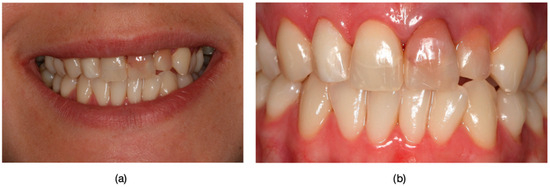 (a) The appearance of the patient’s teeth before prosthetic treatment. (b) Frontal photograph of the patient prior to treatment initiation, highlighting severe dyschromia associated with tetracycline administration to the mother during the 6th month of pregnancy. The color of the teeth in the upper arch differs from those in the lower arch due to the presence of partially mobile or fixed prosthetic restorations adapted to the remaining teeth or potential prosthetic space in the lower arch.