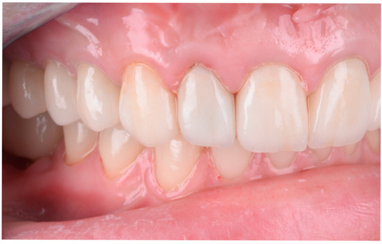 Lithium disilicate restorations were placed using adhesive cementation techniques. Tooth preparation focused on preserving enamel or, where necessary, superficial dentin. Following the removal of provisional restorations, final restorations were assessed for fit, occlusion, and shade matching (Figure 6; Figure 7). The lithium disilicate crowns were etched for 60 s with 3% to 7% hydrofluoric acid (IPS Ceramic Etching Gel, Ivoclar Vivadent, Schaan, Liechtenstein), thoroughly rinsed, and dried. Any crystalline residue left from the etching process was removed with 36% orthophosphoric acid (Blue Etch, Cerkamed, Stalowa Wola, Poland) for 60 s. The etched surfaces were then treated with silane (Monobond Plus, Ivoclar Vivadent, Schaan, Liechtenstein) for 60 s and dried.