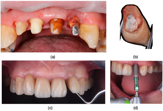 (a) The appearance of the teeth before fixation. (b) The appearance of tooth 2.2 with a layered zirconia restoration after removal from the oral cavity. (c) Mobility caused by the tooth fracture. (d) Replacement of the fractured and compromised dental unit through implant treatment.
