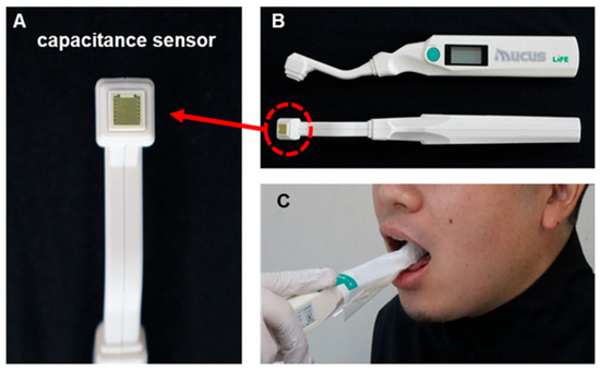 The amount of oral mucosal moisture was measured using a Mucus® capacitance sensor (Life Co., Ltd., Saitama, Japan; Figure 1), which easily measures oral moisture within 2 s [28]. The moisture content of the substance was determined by calculating the capacitance from the dielectric constant of the substance, using the same principle as that for the skin moisture sensor. Water has a much higher dielectric constant than other substances. Therefore, the percentage of water in a substance can be determined by measuring its dielectric constant. The value (%) obtained using an oral moisture meter was based on the gravimetric moisture content of a standard sample of dry protein membrane designed for medical use and is expressed as a percentage of the moisture content. Moisture content was determined using the following gravimetric method: