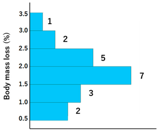 A total of 21 participants, with ages ranging from 29 to 78 (mean ± standard deviation [SD]: mean 48 ± 12.7), were included in the study, comprising 11 men (age, mean ± SD: 51.3 ± 13.2 years) and 10 women (age, mean ± SD: 44.6 ± 10.8 years). The weather was sunny, and the WBGT was 13.1 °C at the start and 16.2 °C at the end of LSD training; thus, the risk of dehydration and heat stroke was generally assumed to be low. The exercise indices and dehydration assessment data are presented in Table 1 and Table 2, respectively. With regard to exercise load, there were notable individual differences in heart rate and running distance. However, the results of the Borg scale indicate that the exercise load was, to some extent, homogenized among the participants, although it was an internal load. Body weight was lower after vs. before training, and the difference was 1.1 ± 0.5 (Table 2). The BML was 0.5–1.5% in six athletes, 1.5–2% in seven athletes, and >2% in eight athletes (Figure 2).