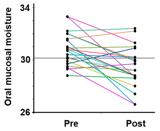 Changes in the oral mucosal moisture content in all participants. The intra-individual data variation is connected by lines. Pre indicates pre-exercise data; post indicates post-exercise data.