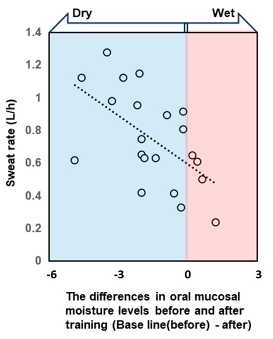The scatterplot shows the correlation between the sweat rate during training and the difference in oral mucosal moisture content before and after training. Negative difference values indicate that the oral cavity became drier after exercise. Differences in oral mucosal moisture levels before and after training correlated with the post-exercise sweat rate. Spearman’s rank correlation coefficient: ρ = −0.58, p < 0.001.