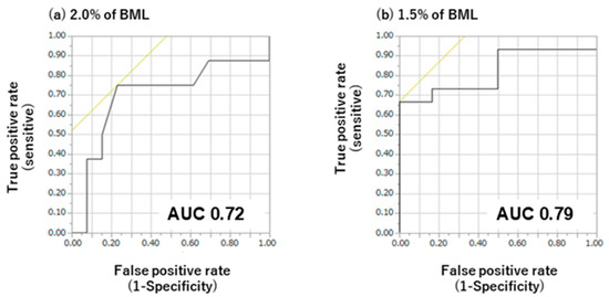 The criterion values for the differences in oral mucosal moisture content obtained via ROC analysis are presented in Figure 5. Statistical analysis of the ROC curves for varying degrees of BML revealed a significant discriminative capacity for oral mucosal moisture changes. At 1.5% BML, oral mucosal moisture had an AUC of 0.79 with a criterion value of 1.9, thus achieving the highest Younden index value. At 2.0% BML, oral mucosal moisture had an AUC of 0.72 with a criterion value of 2.0, thus achieving the highest Younden index value.