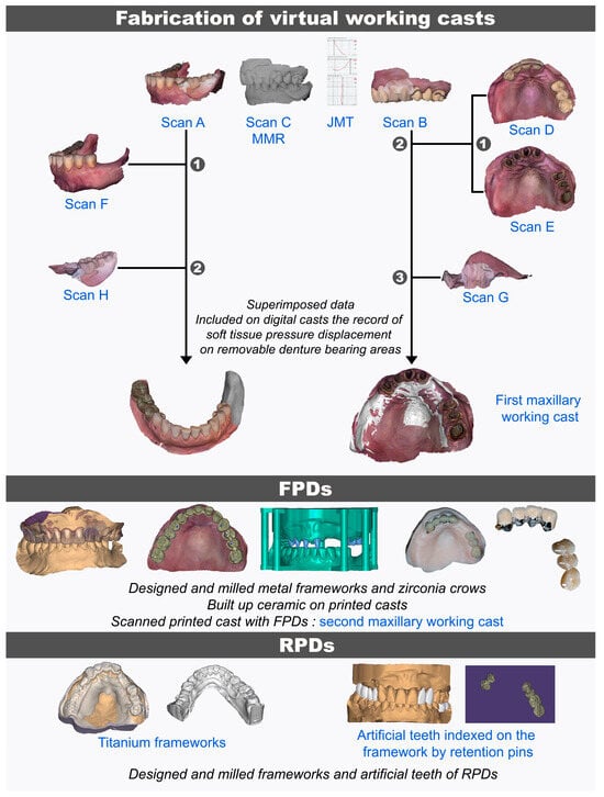 Fully digital workflow studies are based on a virtual patient created by a superimposing facial scan, digital dental arch impressions, maxillomandibular relationship (MMR), and more recently, functional mandibular movements with the jaw motion tracer [18,19,20,21,22]. At the current moment, the digital impression technique does not allow the recording of soft tissue pressure displacement on removable denture-bearing areas [8,23]. Conventionally, a selective pressure impression on the residual ridge is required to fabricate well-fitted RPD with extension base(s) for Kennedy class I and II arches. Previous articles have described altered cast impression methods based on a stone definitive cast, prefabricated teeth, and a physical articulator [24,25,26,27].