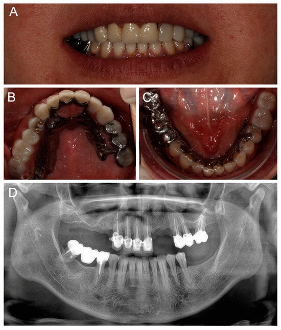 Follow-up at 2 years: (A) smile view; (B,C) occlusal views of maxillary and mandibular definitive prostheses; and (D) panoramic radiography.