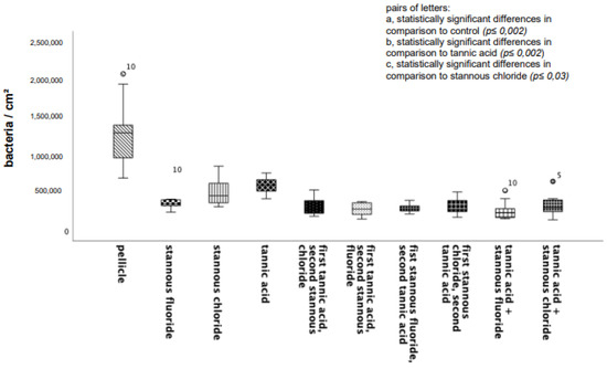 Boxplot diagram. Influence of rinsing with stannous ions containing solutions, tannic acid, and combinations of these solutions on initial bacterial adhesion to enamel bovine slabs in situ over 8 h. Slabs without rinsing served as a negative control (pellicle). Evaluation of the bacterial colonization with the DAPI method. Columns marked with the same pair of letters are significantly different (Mann–Whitney U test followed by Bonferroni–Holm correction, p < 0.002–0.03); n = 200 bovine samples.