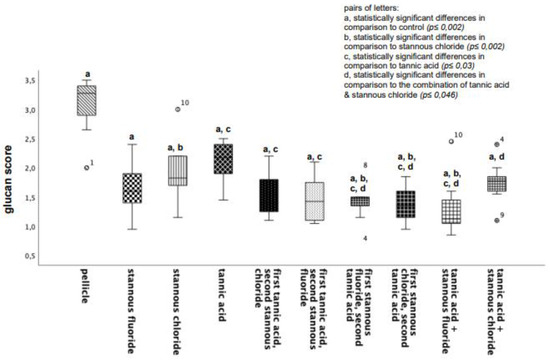 Boxplot diagram. Influence of rinsing with stannous ions containing solutions, tannic acid, and combinations of these solutions on glucan synthesis in situ over 8 h. Slabs without rinsing served as a negative control (pellicle). Evaluation of glucan synthesis was performed with the Con A staining method. Columns marked with the same pair of letters are significantly different (Mann–Whitney U test followed by Bonferroni–Holm correction, p < 0.002–0.046); n = 200 bovine samples.
