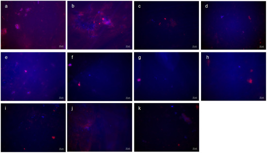 Representative images visualize bacterial colonization and glucan synthesis on the bovine enamel surface after 8 h of oral exposition (Figure 3). Based on these, blue DAPI staining indicates adherent bacteria at the pellicle layer as well as bacteria–glucan agglomerates in combination with the glucan staining (Con A—red). (A) and (b) show images after 8 h oral exposition without rinsing. Red fluorescent glucan ring structures surrounding blue, fluorescent bacteria are clearly visible (a). Furthermore, bacterial accumulations were surrounded by diffuse glucan clouds (b). A significant reduction in adherent bacteria and glucan structures can be detected after rinsing with stannous chloride, stannous fluoride, and tannic acid (c–e). In addition, small bacterial clusters show distinct glucan structures (c,d). The successive application of the monosubstances (f–i) leads to a further reduction in the bacterial adherence tp the tooth surface. The greatest reduction in adherent bacteria was achieved by the combined rinsing with tannic acid and stannous fluoride (k). As such, no glucan structures were detectable (k).