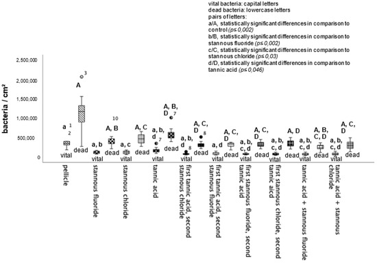 Boxplot diagram. Influence of rinsing with stannous ions containing solutions, tannic acid, and combinations of these solutions on initial bacterial colonization in situ over 8 h. Slabs without rinsing served as a negative control (pellicle). Evaluation of vital and dead bacteria with the BacLight method. Columns marked with the same pair of letters are significantly different (Mann–Whitney U test followed by Bonferroni–Holm correction, p < 0.002–0.046); n = 200 bovine samples.