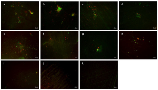 Fluorescence microscopy, BacLight staining: (a,b) control without rinsing; (c) stannous chloride; (d) stannous fluoride; (e) tannic acid; (f) stannous chloride first, tannic acid second; (g) stannous fluoride first, tannic acid second; (h) tannic acid first, stannous chloride second; (i) tannic acid first, stannous fluoride second; (j) combination of tannic acid and stannous chloride; and (k) combination of tannic acid and stannous fluoride. Scale bar in the right corner: 10 µm.