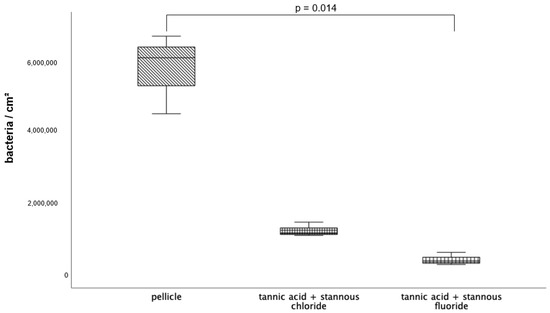 Evaluation of the bacterial colonization with the DAPI method; boxplot diagram. Influence of rinsing with the combinations of tannic acid and stannous chloride and tannic acid and stannous fluoride on initial bacterial adhesion to enamel bovine slabs in situ over 8 h. Slabs without rinsing served as a negative control (pellicle). Columns marked with a parenthesis are significantly different (Mann–Whitney U test followed by Bonferroni–Holm correction, p < 0.015); n = 18 bovine samples.