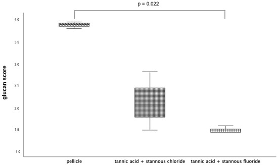 Evaluation of the glucan synthesis, performed with the Con A staining method, presented in a boxplot diagram. Influence of rinsing with the combinations of tannic acid and stannous chloride and tannic acid and stannous fluoride on initial bacterial adhesion to enamel bovine slabs in situ over 48 h. Slabs without rinsing served as a negative control (pellicle). Columns marked with a parenthesis are significantly different (Mann–Whitney U test followed by Bonferroni–Holm correction, p < 0.023); n = 18 bovine samples.
