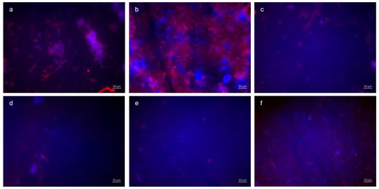Fluorescence microscopy, combination of DAPI and Con A staining: (a,b) control without rinsing, (c,d) combination of tannic acid and stannous chloride, and (e,f) combination of tannic acid and stannous fluoride. Representative images visualize bacterial colonization and glucan synthesis on the bovine enamel surface after 48 h of oral exposition. Scale bar in the right corner: 10 µm.