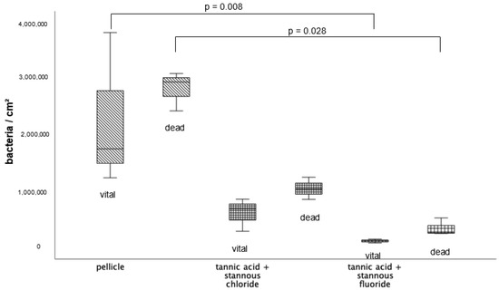 BacLight staining method boxplot diagram. Influence of rinsing with the combinations of tannic acid and stannous fluoride and tannic acid and stannous chloride on initial bacterial colonization in situ over 48 h. Slabs without rinsing served as a negative control (pellicle). Evaluation of vital and dead bacteria with the BacLight method. Columns marked with a parenthesis are significantly different (Mann–Whitney U test followed by Bonferroni–Holm correction, p < 0.029); n = 18 bovine samples.