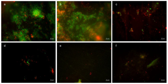 Fluorescence microscopy, BacLight staining method: (a,b) control without rinsing, (c,d) combination of tannic acid and stannous chloride, and (e,f) combination of tannic acid and stannous fluoride. Scale bar in the right corner: 10 µm.