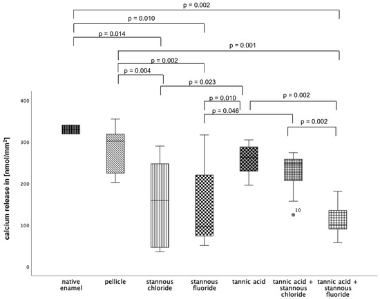 Cumulative calcium release of enamel slabs after 30 min of pellicle formation with application of stannous chloride, stannous fluoride, tannic acid, and the combinations of tannic acid + stannous chloride and tannic acid + stannous fluoride in situ followed by incubation in HCl (pH 3.0) for 120 s. Specimens without and with pellicle served as controls Significantly different data is marked with parenthesis. At pH 3.0, pellicle formation did not reduce calcium release significantly. A significant reduction in calcium release was observed after rinsing with stannous chloride, stannous fluoride, and the combination of tannic acid and stannous chloride, as well as the combination of tannic acid + stannous fluoride, compared to the native enamel and the pellicle control (p ≤ 0.03). The greatest reduction in calcium loss was achieved by stannous chloride, stannous fluoride, the combination of tannic acid + stannous chloride, and the combination of tannic acid + stannous fluoride (Kruskal–Wallis test, Mann–Whitney U test, and Bonferroni–Holm correction); n = 120 bovine samples.