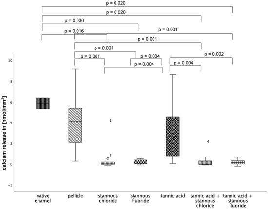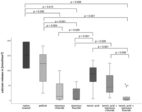 Cumulative calcium release of enamel slabs after 30 min of pellicle formation with application of stannous chloride, stannous fluoride tannic acid, and the combinations of tannic acid + stannous chloride and tannic acid + stannous fluoride in situ followed by incubation in HCl (pH 2.3) for 120 s. Specimens without and with pellicle served as controls. Significantly different data is marked with parenthesis. At pH 2.3, pellicle formation did not reduce calcium release significantly. A significant reduction in calcium release was observed after rinsing with stannous chloride, stannous fluoride, and the combination of tannic acid + stannous fluoride compared to the native enamel and the pellicle control (p ≤ 0.036) The greatest reduction in calcium loss was achieved by stannous fluoride and the combination of tannic acid + stannous fluoride (Kruskal–Wallis test, Mann–Whitney U test, and Bonferroni–Holm correction); n = 120 bovine samples.