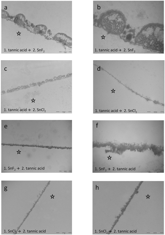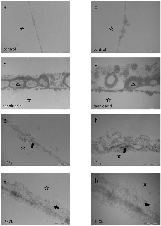Representative TEM images visualize the pellicle’s ultrastructure. Intraoral exposure time: 8 h. (a,b) Magnification 23,000- and 49,000-fold; rinsing with tannic acid for 10 min followed by stannous fluoride for 1 min leads to significant effects on the modification of the pellicle layer. The pellicle appears more electron-dense and thicker compared to the control samples. (c,d) Magnification 23,000- and 49,000-fold; rinsing with tannic acid for 10 min followed by stannous chloride for 1 min. (e,f) Magnification 18,500- and 49,000-fold; rinsing with stannous fluoride for 1 min followed by tannic acid for 10 min. This subsequent rinsing leads to a distinct modification of the pellicle layer. Compared to the other combinations, the pellicle was massively electron-dense. Incorporation of stannous ions first and the effects of the tannic acid rinsing second resulted in the most intense density in the present experiments. In addition, rinsing with tannic acid second had intense tanning effects at the pellicle layer. (g,h) Magnification 23,000- and 49,000-fold; rinsing with stannous chloride for 1 min followed by tannic acid for 10 min. The subsequent rinsing leads to an offsetting of the negative effects from stannous chloride rinsing. No protein infiltrations were observed below the pellicle layer. Since the stannous chloride solution still had a pH 2.5, rinsing with tannic acid seems to nullify the demineralizing effect of the stannous chloride solution. The former enamel site is marked by a hollow star. Scale bar in the right corner: (a,c,e,g): 0.5 µm; (b,d,f,h): 1 µm.