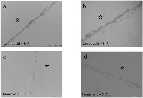Combined rinsing with tannic acid and stannous fluoride neutralizes the above-described effects of the single solutions since the pellicle layer is less thick and electron-dense. A similar effect was investigated for the combination of tannic acid and stannous chloride. When both combinations are compared, the combination of tannic acid and stannous fluoride seems to form a thicker pellicle layer (Figure 15a,b) than the combination of tannic acid and stannous chloride (Figure 15c,d).