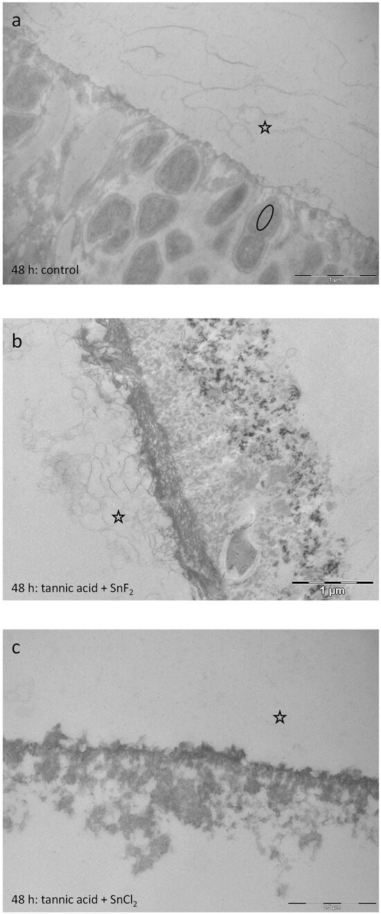Representative TEM images visualize the pellicle’s ultrastructure. Intraoral exposure time: 48 h. (a) Typical sample of a control pellicle layer (no rinsing) consisting of an electron-dense basal layer and less electron-dense globular protein compounds above. Intact bacteria are detectable (oval). (b) Rinsing with tannic acid and stannous fluoride for 10 min, pH 3.2. Rinsing with this combination leads to an electron-dense basal pellicle layer with protein infiltrations below. (c) Rinsing with tannic acid and stannous chloride for 10 min. pH 2.45. Protein infiltrations are detectable below the basal layer of the pellicle. The former enamel site is marked by a hollow star. Scale bar in the right corner: (a,b): 1 µm; (c): 0.5 µm.